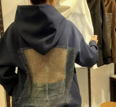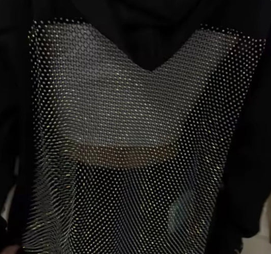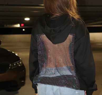 Hanorac cu croială lejeră, realizat din material confortabil și rezistent, potrivit pentru purtare zilnică. Designul este definit de inserția amplă din plasă tip mesh poziționată pe partea din spate, care creează un efect transparent și lasă spatele vizibil, oferind piesei un aspect distinct și modern.